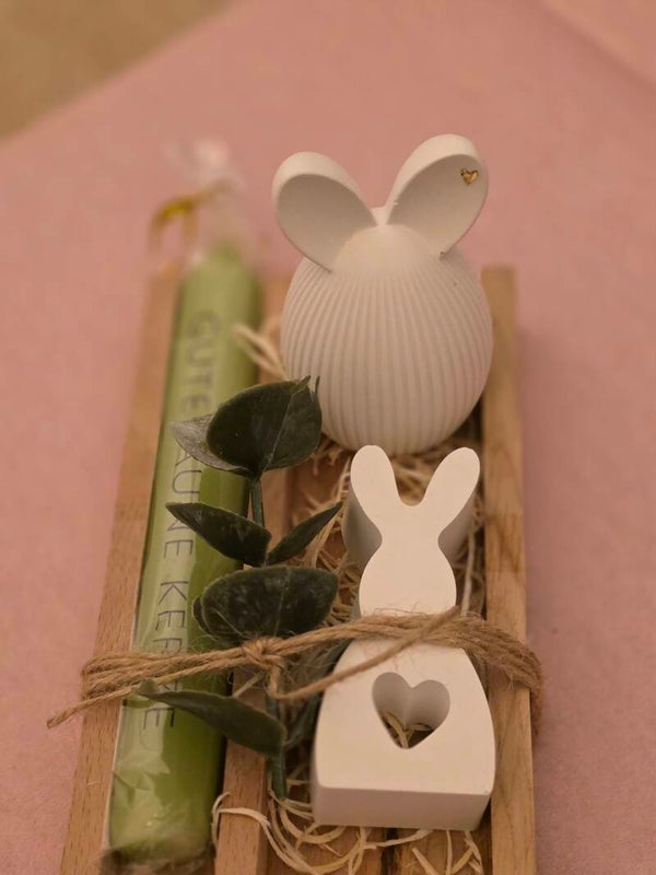 Liebevoll zusammengestelltes Oster-Set bestehend aus einem Keracraft-Hasen, einer Stabkerze sowie dekorativen Elementen auf einem Holztablett.